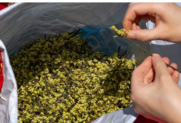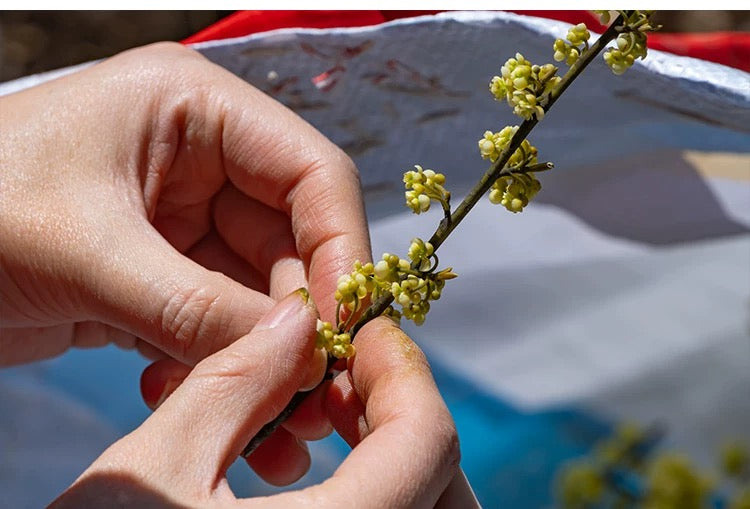To pick the flowers that are just blooming in early spring, you can go to the high-altitude villages around Xiaoyang Town, or walk for 1-2 hours into the mountains. Our tea farmers pick them from old trees beside streams and on stone walls.