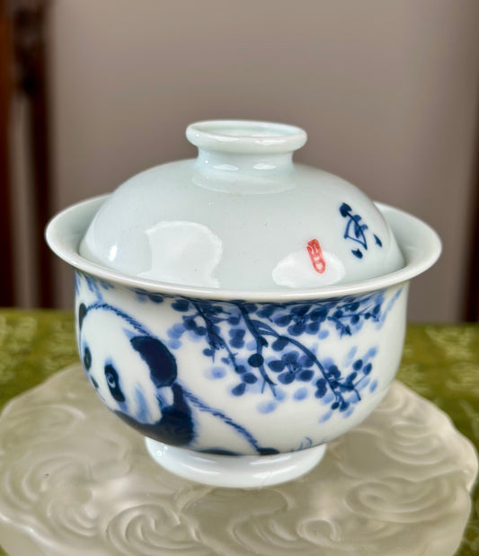 Hanpainted Chinese Blue White Porcelain Panda Teapot Gaiwan Set Jingdezhen Artwork