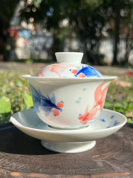 Handpainted Teapot Chinese Fish Brush Painting Pattern Teaset Jingdezhen Gaiwan Set