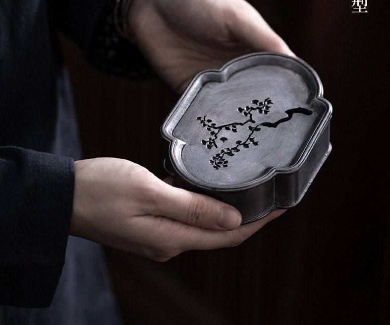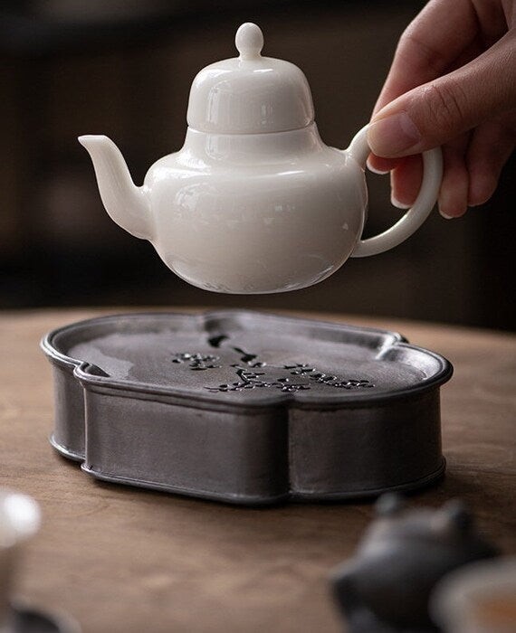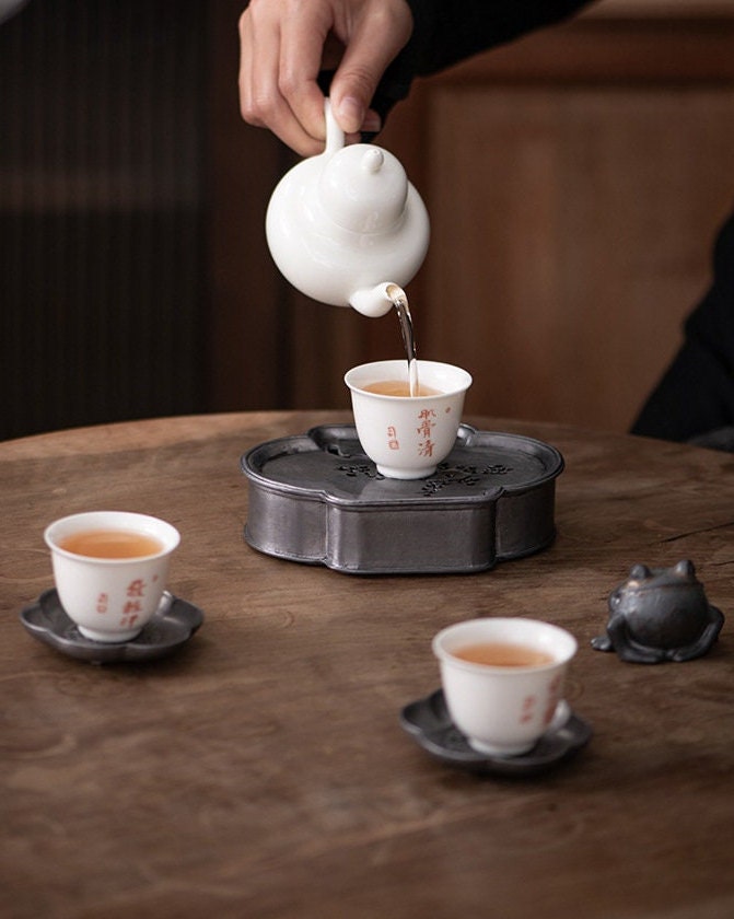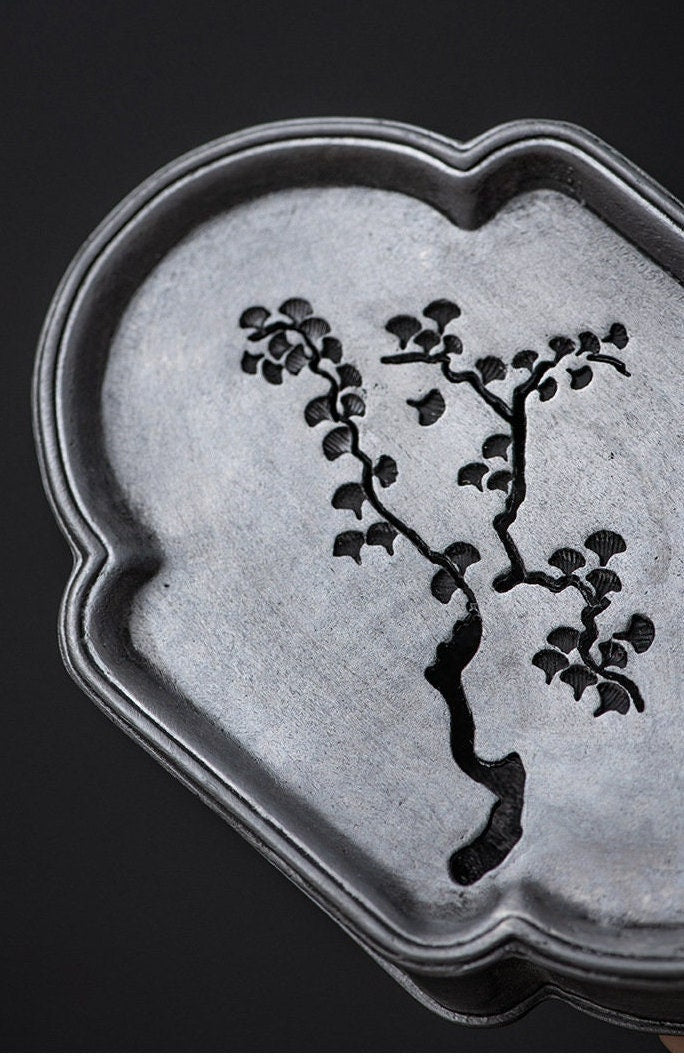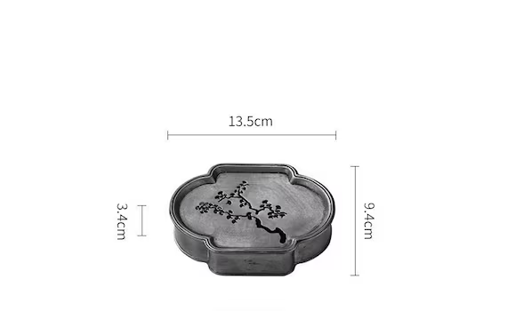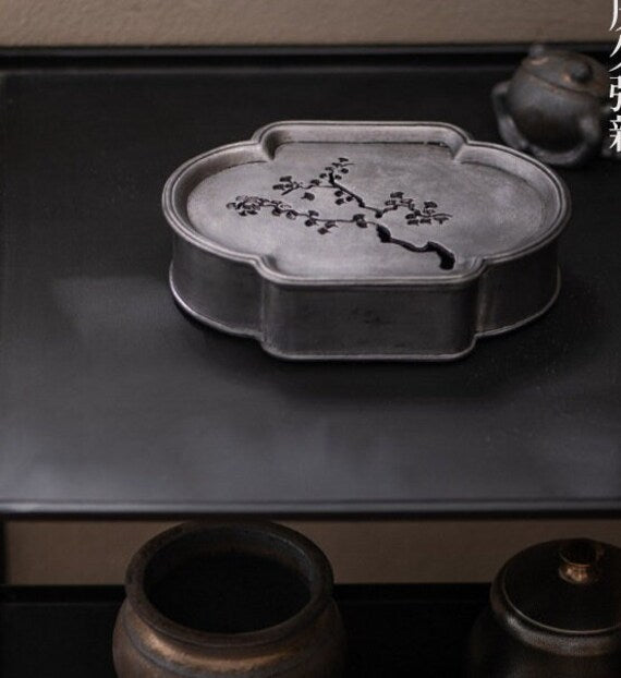 this tea tin tray is a hand-forged by experienced Quanzhou tin artisans and there is elegant tree pattern on it.