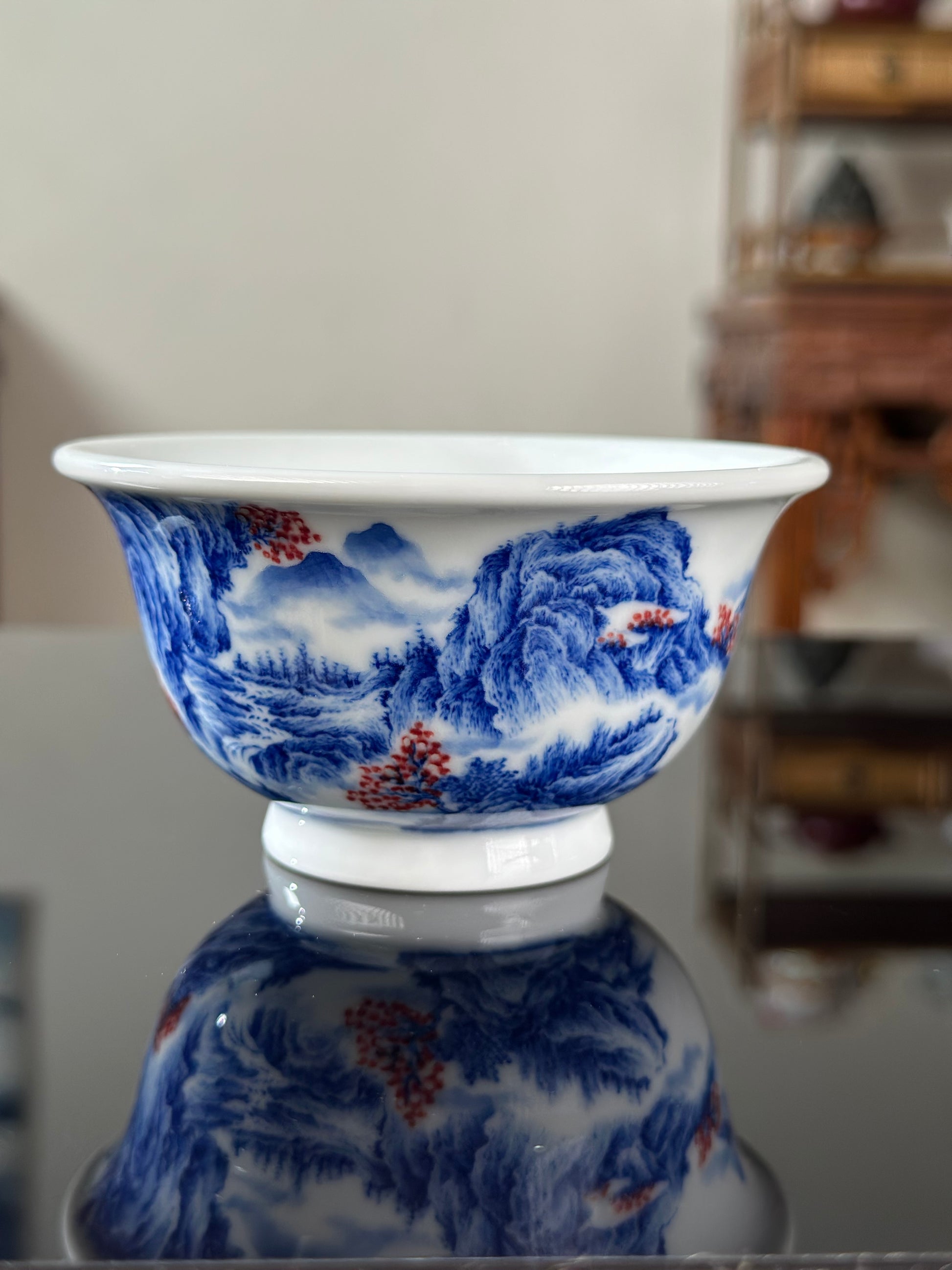 Handpainted Chinese Blue and White Underglaze Red Youlihong Porcelain Jingdezhen Mountain Landscape Pattern Teacup