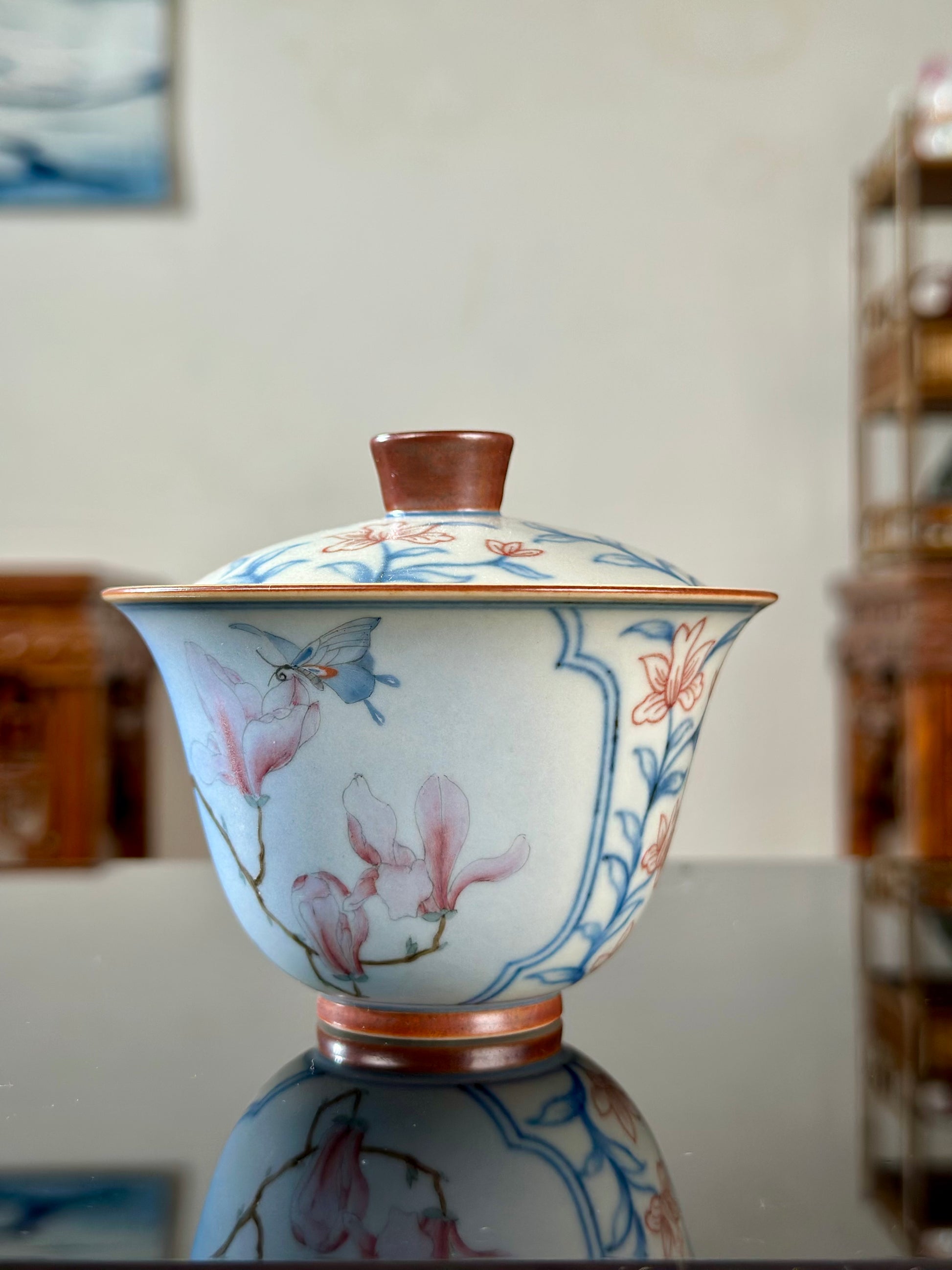This Jingdezhen gaiwan is painted with a Chinese traditional Flower and Bird pattern. Imitating antique painting style. The structure is shaped like a classical Chinese window, and you can appreciate the beautiful view through it.